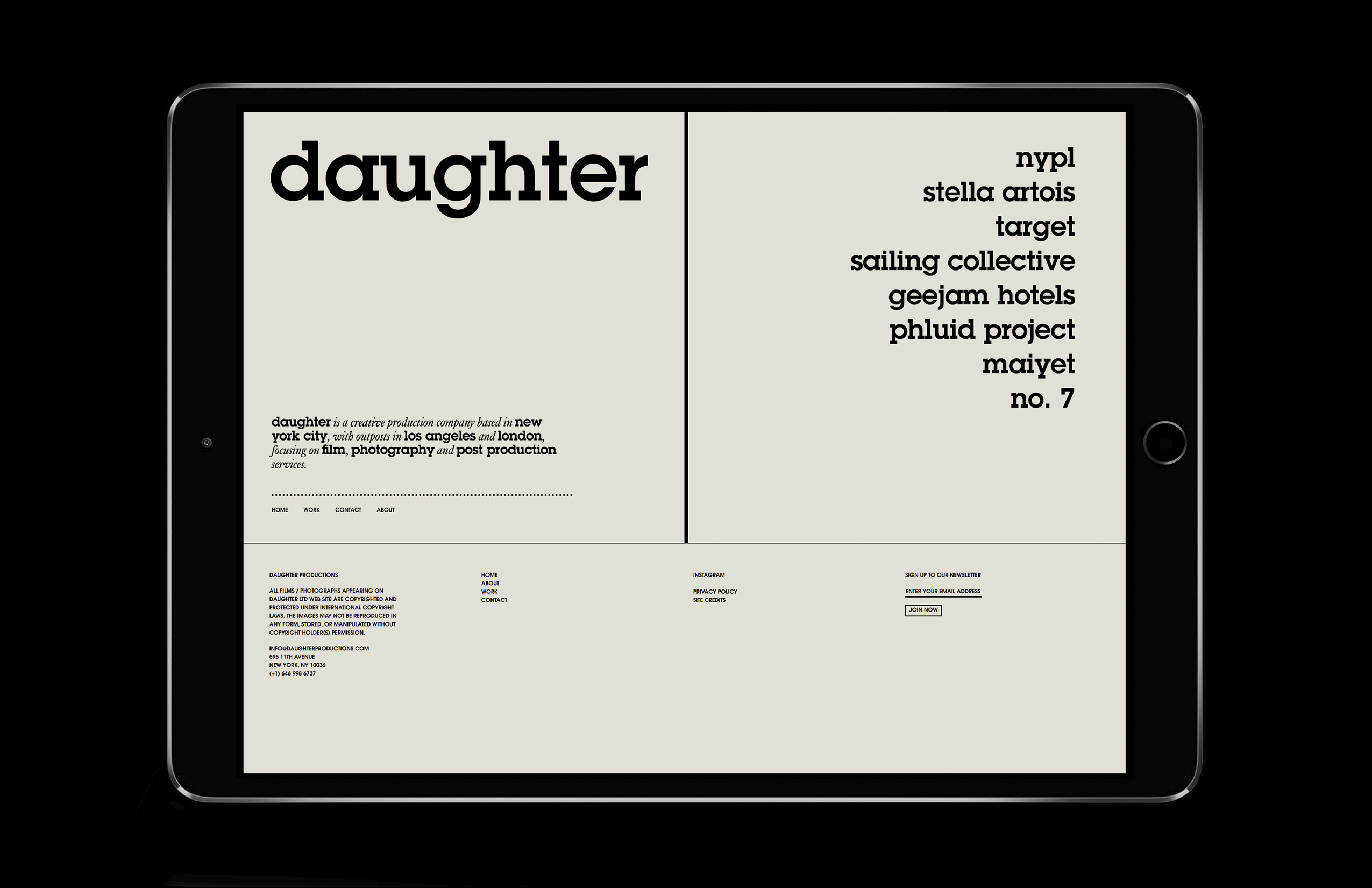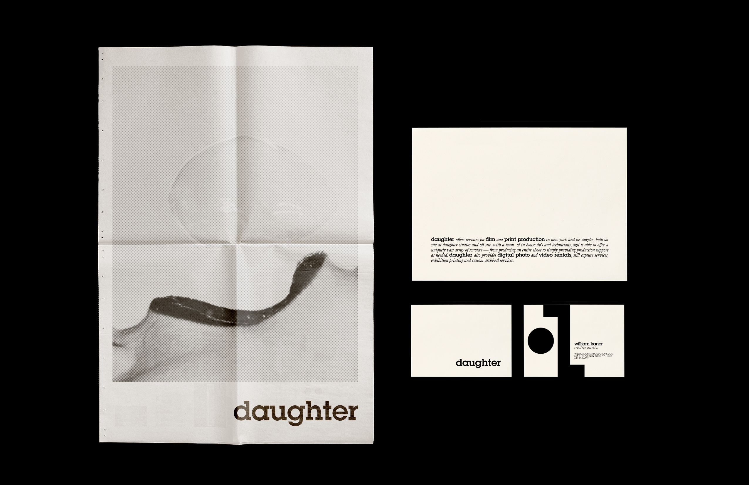 Daughter is a film production company, part of the renowned agency Mother. The inspiration behind their identity was the history of cinema. We were commissioned to develop their branding across all mediums, stationery, printed materials and web design